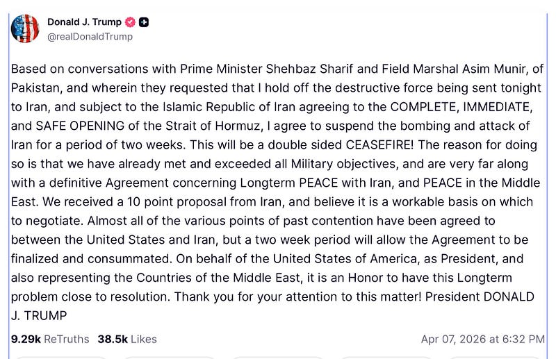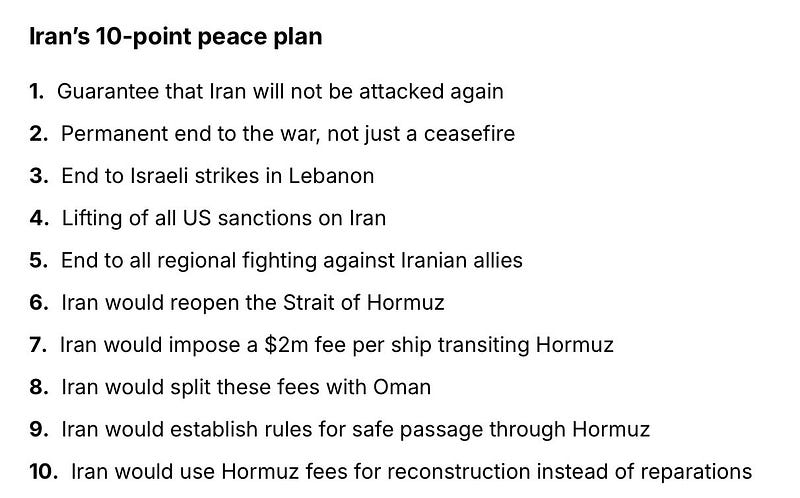 Trump calls Iran’s 10 point plan “a workable basis on which to negotiate.” But hard to imagine U.S. accepting Iran charging a $2M toll on oil tankers, ending all U.S. sanctions on Iran, ending Israeli strikes in Lebanon, or the other ter…