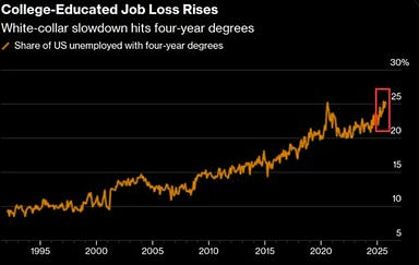 Americans with four-year college degrees now account for a record 25.3% of U.S. unemployment.
