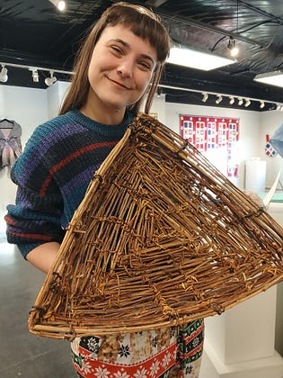 Triangle basket is made with eseni, esni ggwa, q'eylish ch'u q'unqelash. Cottonwood, aspen, willow and spruce root.