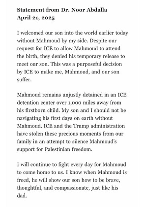 Mahmoud Khalil was denied a temporary release today to be with his wife, Dr. Noor Abdalla, as she gave birth to their 1st child, a son: “ICE and the Trump administration have stolen these precious moments from our family in an attempt to silence Mahmoud’s support for Palestinian freedom.”