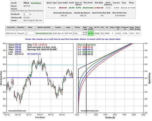 For those with higher capital, I see a decent directional potential for a pre-ER IV related play on NFLX (Earnings scheduled for April 18th AMC). I’m considering the following entry today if it closes above $337. Exit is at either 50% loss or before close on the 18th.