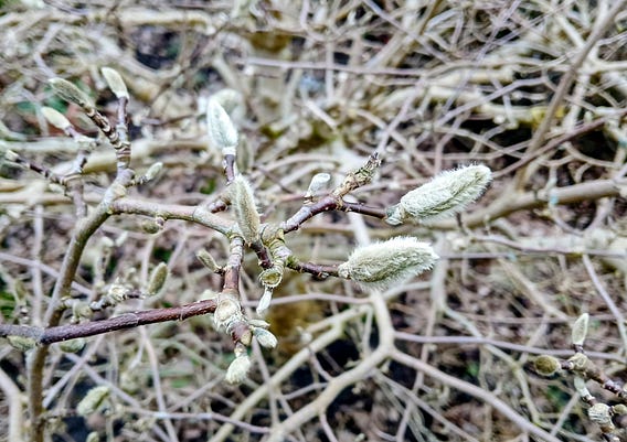 One of my neighbours has a small magnolia in the garden. In a few weeks time, it will burst into flowers and brighten the whole street. For now, these fluffy buds are just a promise of colour, but I think they already look beautiful.