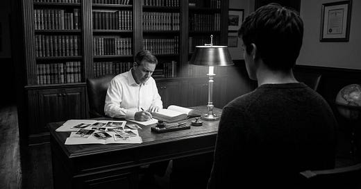 He sat behind the desk in a white shirt, sleeves rolled once at the cuff. His tie hung loose but still knotted -- formal hours over, authority intact. The brass lamp threw half his face into shadow, carving the lines deeper. His quad lay open, one finger holding a verse in Doctrine and Covenants. He didn’t lift his head when I stepped inside.