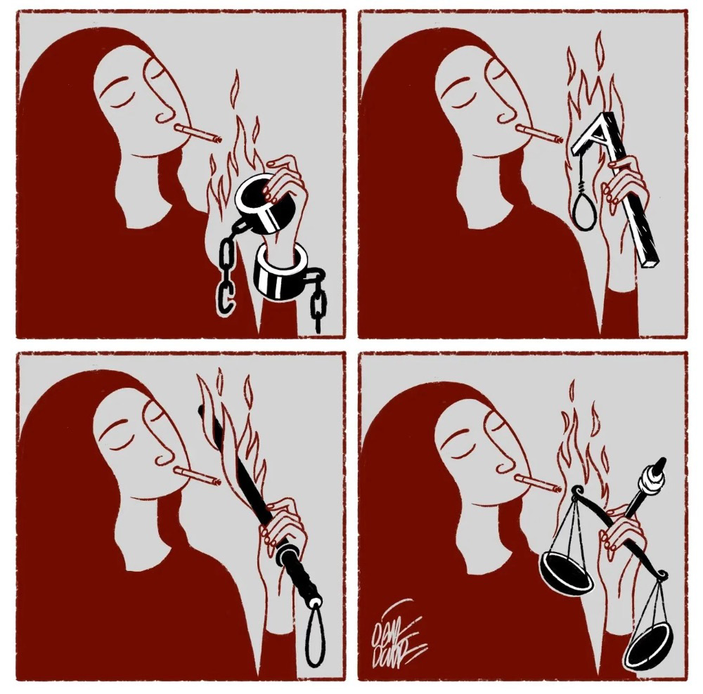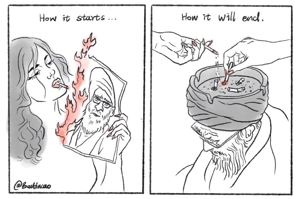 From the streets to social media, artists are turning outrage into visual fire. Girls light cigarettes with Khamenei’s picture (smoke ‘em if ya got ‘em!) and extinguish them atop the Ayatollah’s turbaned head like an ash tray — piss art, cigarette, absurdist, surrealist, furious. The lion roars over the Islamic Republic. Some of it is far out, chaotic, almost gleefully unhinged, yet every piece hits the same point: power can be mocked, control can be challenged, and creativity refuses to be censored. This isn’t gallery art — it’s art as defiance, mischief, and revolution.