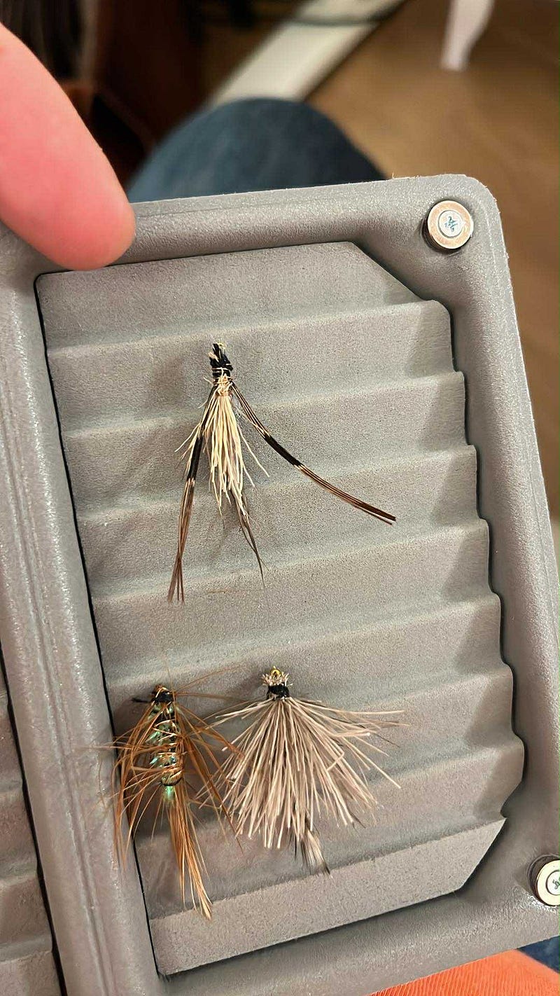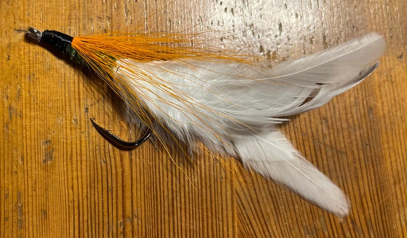 The fly of the day was another big one: A Deceiver streamer; white schlappen feathers (from near the rooster tail), green chenille body, with some colored bucktail.