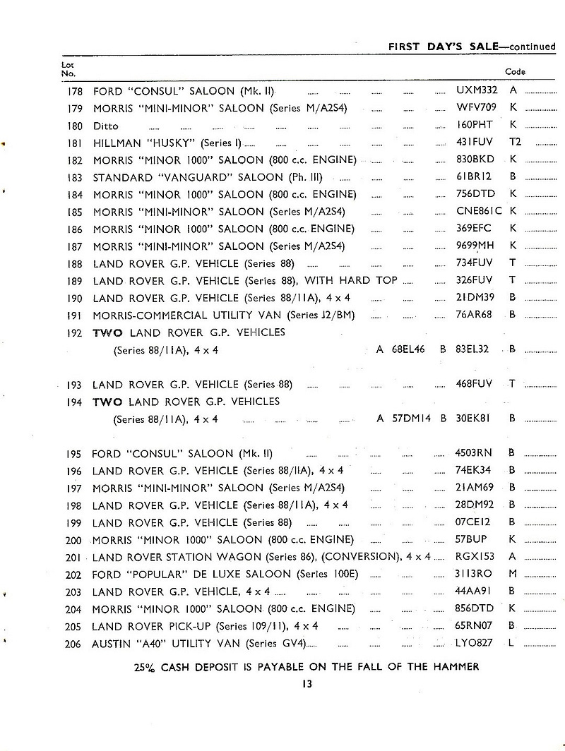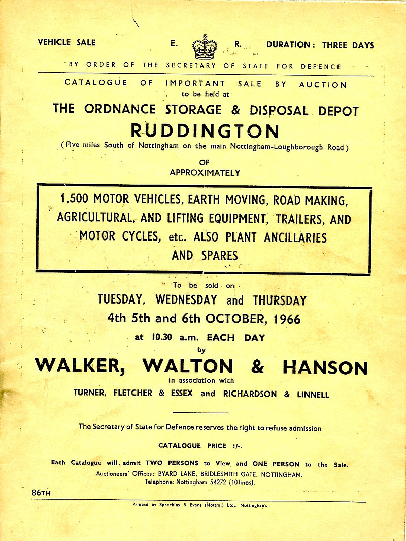 At the end of its Royal Air Force service as 44AA91, the '53 80" I drive was auctioned off at Ruddington Depot in Nottingham on 4 Oct 1966. I have been looking for the auction catalog(ue) for years, so was very pleased that a Land Rover Series One Club (LRSOC) member had one and kindly sent me a scan. The truck was Lot 203, "Land Rover G.P. Vehicle, 4x4".