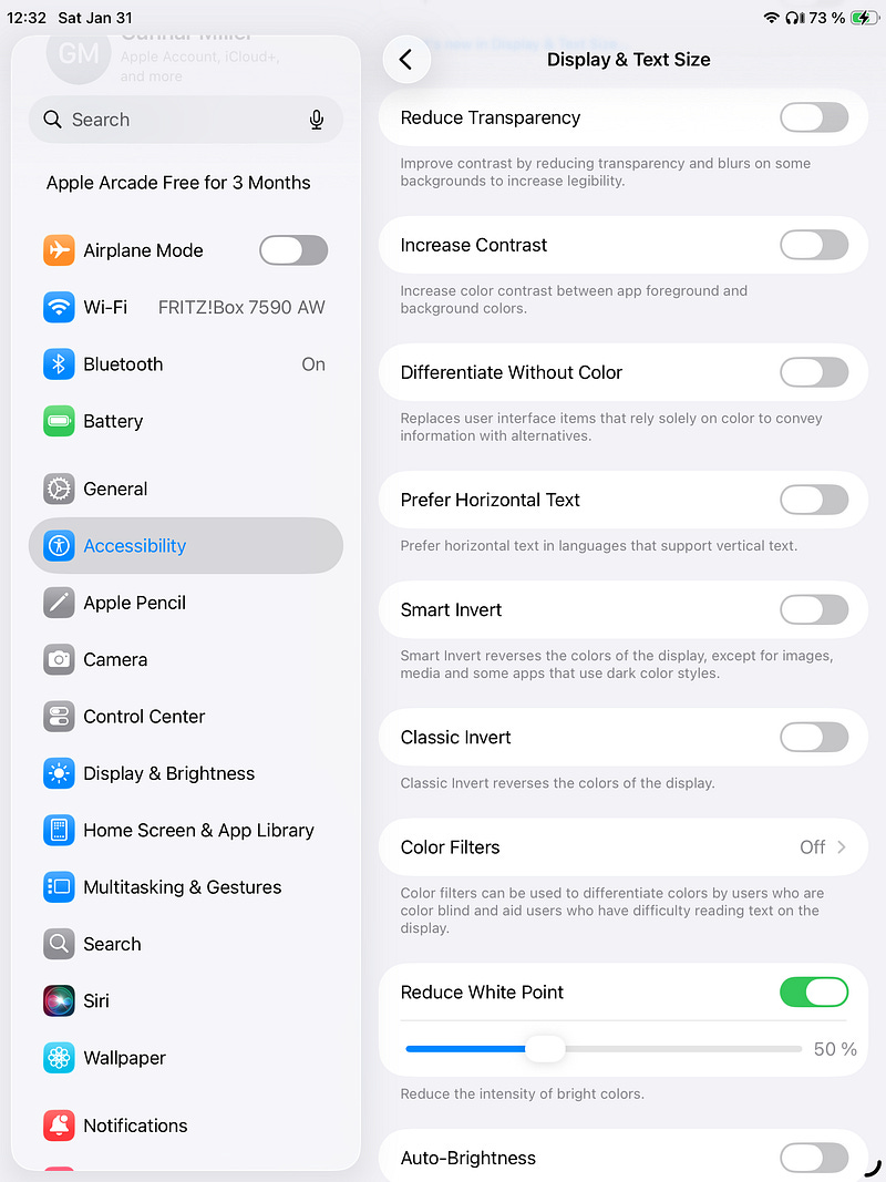 Reduce White Point → ON, set to around 50%; this stabilizes luminance so the clock renderer doesn’t keep “protecting” the panel.