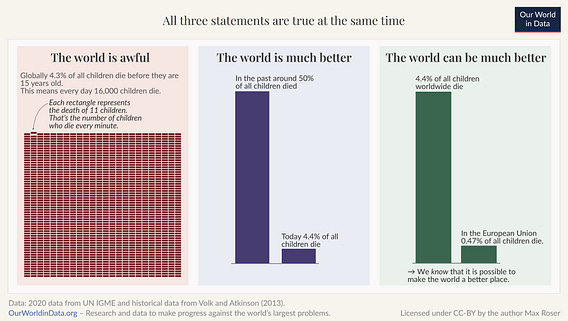 When statisticians say “the world is getting better”, it provokes a lot of outrage, because for many people the world is still awful. But the two arguments can be true at the same time; the world is both bad and better.
