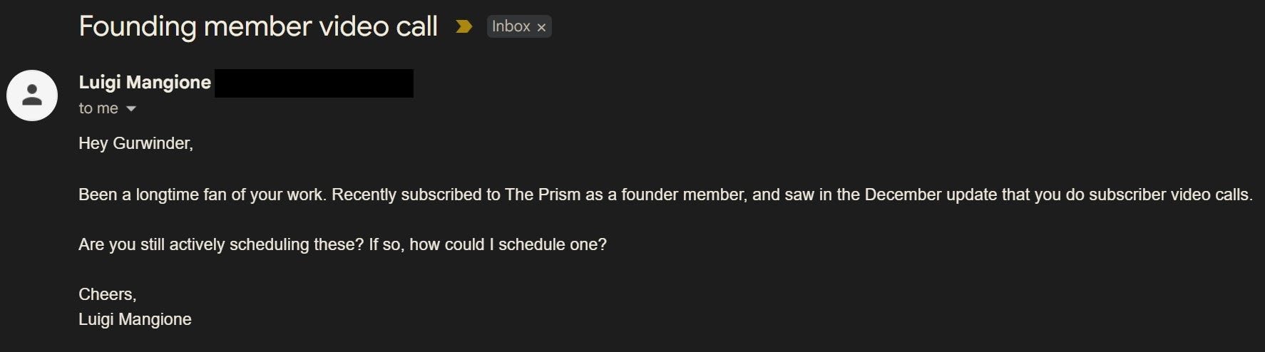 Luigi Mangione, the suspected shooter of the United Healthcare CEO, is a founding member of my Substack, and someone I’ve been friendly with for a while. I hope there’s been some kind of a mix-up, because this doesn’t seem like him at all.
