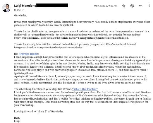 I’ll give my full take on Luigi Mangione in an essay published soon. In the meantime, here’s a further glimpse into his personality. Hard to imagine the guy who wrote this could commit an assassination.