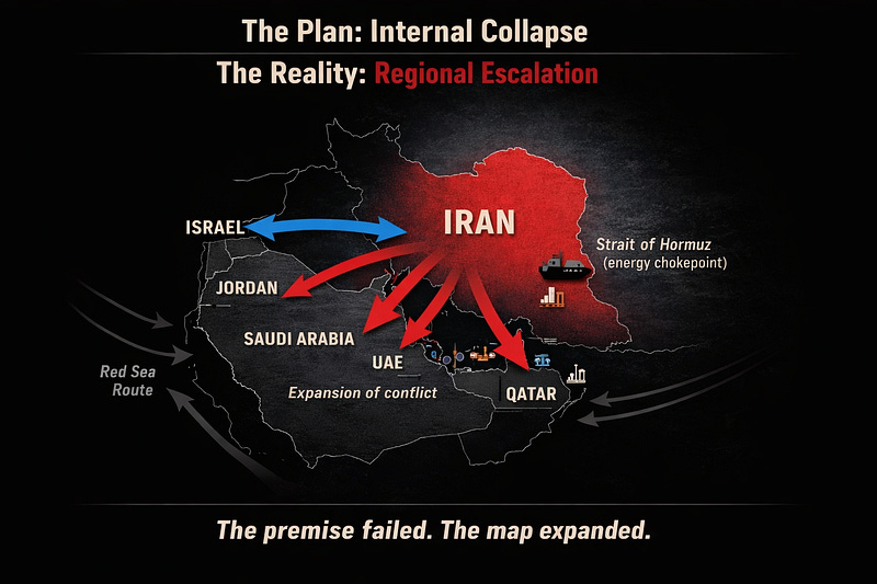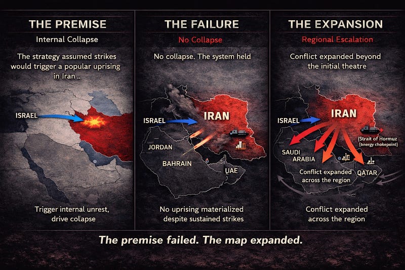 Because when the assumption that underpinned the war collapses, but the war itself continues, what follows is not a coherent plan being executed. It is escalation attempting to compensate for a premise that no longer holds.
