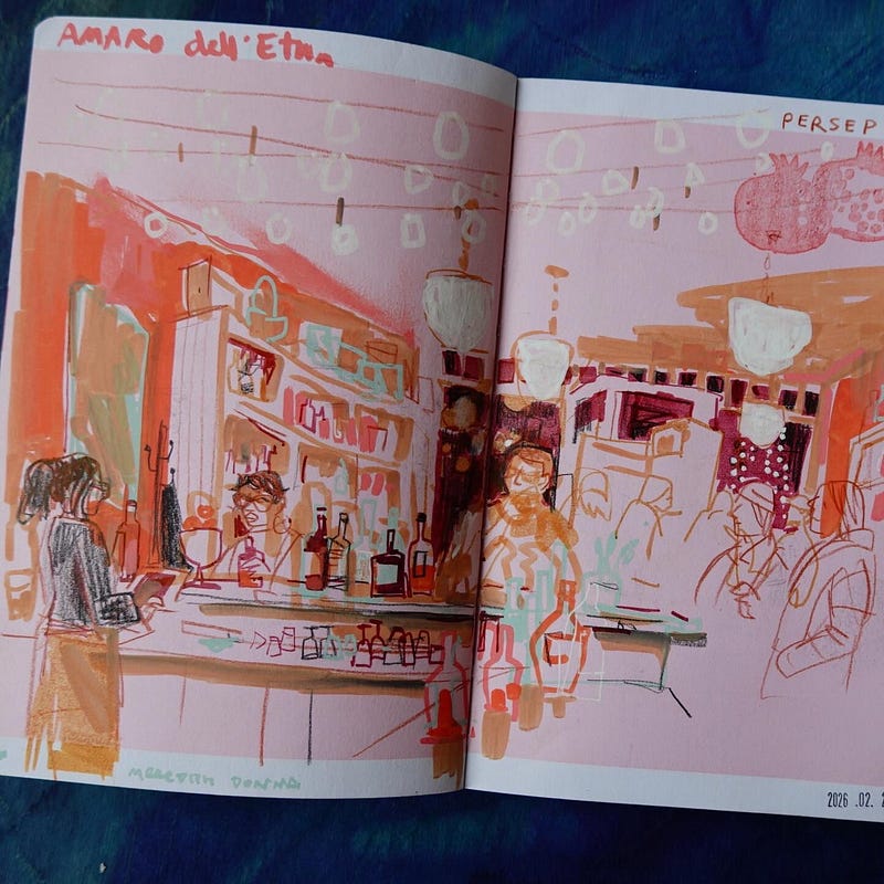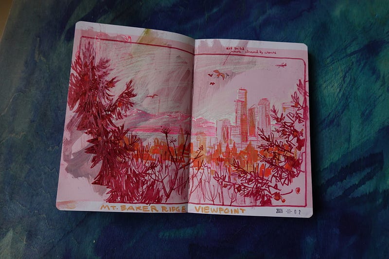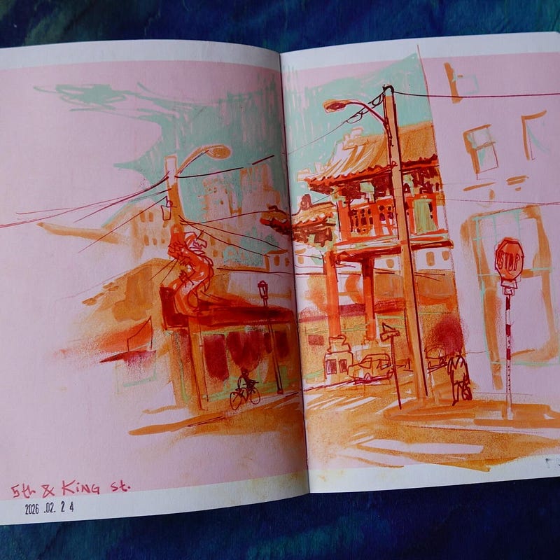 On location sketches on pink paper! Using a selection of pencils and markers in my pen pouch. wet media is not the move in this sketchbook but other tools work pretty well.
