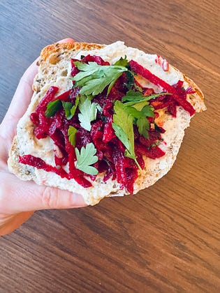 Ett litet förmiddagsmellis : bröd bakat med vita bönor, bönröra och rödbets- och äppelsallad med syrlig dressing 😋😍 När det står redo tar det mindre än 1 minut att bygga ihop 🙏Och detta är ju då veckans mellis! I din inkorg om några timmar. Preppen och recepten alltså. Själva brödet, röran och salladen får ni knåpa ihop själva 🤗 👩🏻🍳