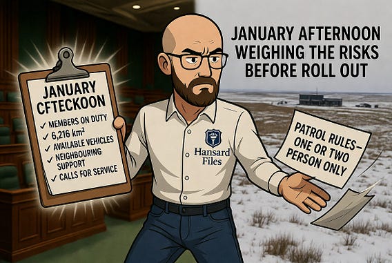 In the Melfort Detachment briefing room one January afternoon in 2024, the supervisor set aside the old patrol rules and opened the new risk assessment checklist. Rigid decisions on one-person or two-person vehicles vanished. Every shift would now weigh live factors before any member rolled out alone.