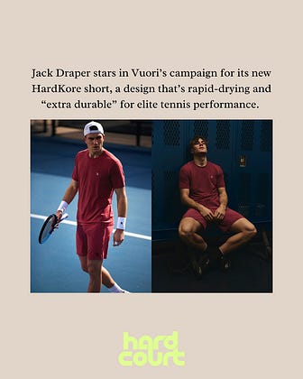 Jack Draper stars in Vuori’s campaign for its new HardKore short, a design that’s rapid-drying and meant to be “extra durable” for elite tennis performance.