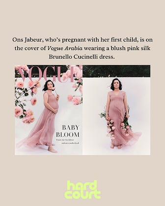 Ons Jabeur, who’s pregnant with her first child, is on the cover of Vogue Arabia wearing a silk Brunello Cucinelli dress.