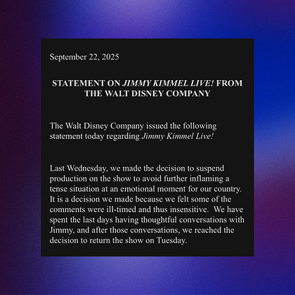 ABC has announced that Jimmy Kimmel will be back on the air starting tomorrow 9/23
