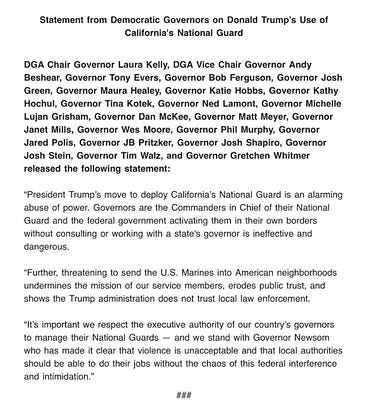 🚨BREAKING: Every Democratic Governor just signed on to a statement SLAMMING Trump for abusing his power and sending the National Guard in to LA. This is what unity looks like. Share this statement everywhere!