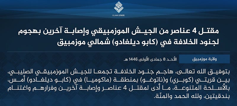 The ISIS terrorist organization claims to have carried out an attack in Macomia (Natugo), resulting in the deaths of 4 Mozambican soldiers (their published photos show 2 soldiers and two rifles) and capturing two rifles.