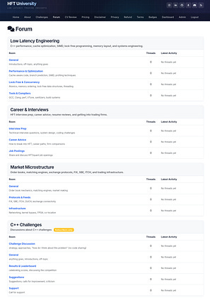 Four discussion boards covering low latency engineering, career and interviews, market microstructure, and C++ challenges. The first three are open to everyone. The challenges forum is for subscribers.