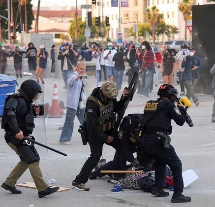 Here, you can see LAPD and Homeland Security smashing a woman's skull and ribcage with the butt of their shotguns and police shields. These scenes are reminiscent of the most brutal military dictatorships from Iran, Egypt, or North Korea.