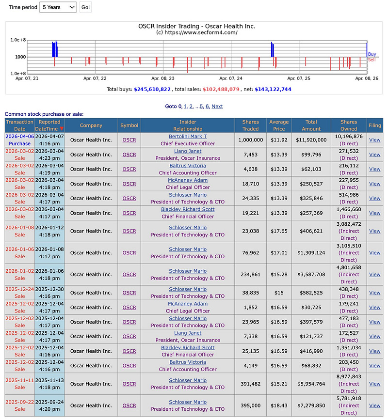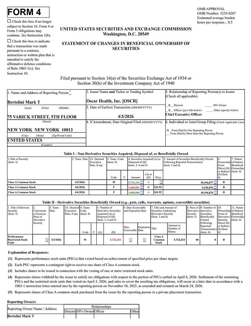 Oscar Health CEO Mark Bertolini buys $11.92 million of shares, marking the first insider purchase this year.