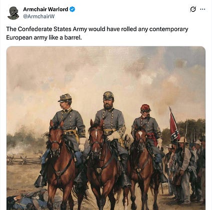 funny but telling how much faith reactionaries put into historical losers like nazis or confederates. these guys fought a defensive war on home turf with highly motivated troops and still lost badly once Sherman demonstrated what operational maneuvers looked like