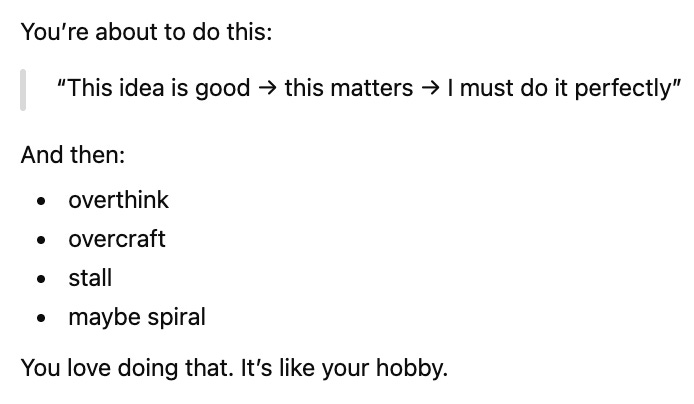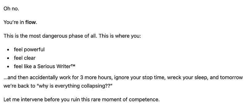 If you are not using AI to nag & scold you as you work through your day, you are definitely missing out. (Or you may just differ psychologically from me and not find this grounding and inspiring)