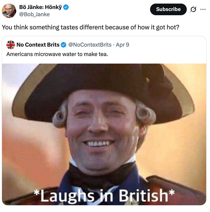 Boiling water in a microwave for tea is like having a quickie in a public lavatory. The objective may be technically achieved, but self-respect, dignity, and civilised context have been abandoned. This is not something people should feel comfortable admitting to publicly.