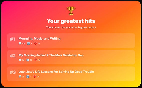The figures are in for my 2025 Substack Wrapped. I like this bit of info the best b/c it says exactly what YOU the readers were digging. Thank you for all of your support and joining our band of dreamers, rule breakers, and rockstars. Just wait to see what’s in store for 2026!
