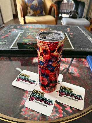 My Dia de Los Muertos tumbler now has cool cork coasters (glass table friendly) for puzzle time. From music stacker Tamara Casey’s new merch store - check it out!