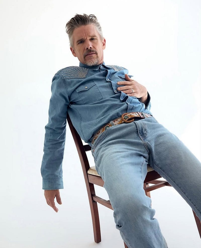 The denim combo was born from the idea that we needed to create a uniform that felt effortless during press, while promoting Blue Moon. He went to every single Q&A, lecture, talk, and ‘For Your Consideration’ event that he was invited to. He was really proud of this work and could brilliantly articulate his thoughts. He wanted to talk about it. So, we wanted something easy that he wouldn’t have to think about, could throw on, feel comfortable in, and still look effortlessly Ethan.