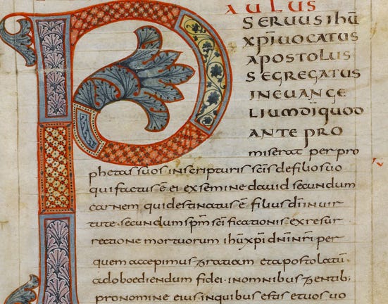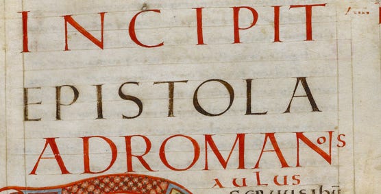 Incipit Epistola Ad Romanos. Paulus servus Christi Iesu vocatus apostolus segregatus in evangelium Dei quod ante promiserat per prophetas suos…