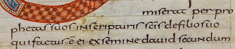 Here’s some Carolingian Miniscule, and it’s really damn difficult to read. As long as it’s in big block Roman capitals, it’s pretty straightforward, but as soon as you get into the text, you’re having to mentally change this tall “r” for an “s”, the “u” and the “v” are the same, remember that abbreviations were common to save space and often vowels are replaced with a macron, the words often stop in the middle and carry on to the next line, and there isn’t much in the way of regular spacing between them. And the spelling of the Latin isn’t exactly the same. Even with my Vulgate open to the first page of the Epistle to the Romans it's a struggle to figure it out.