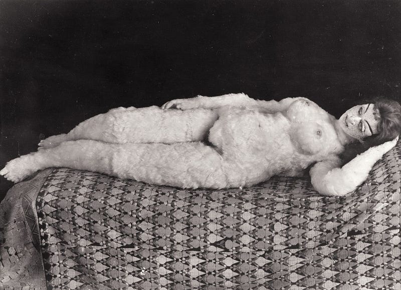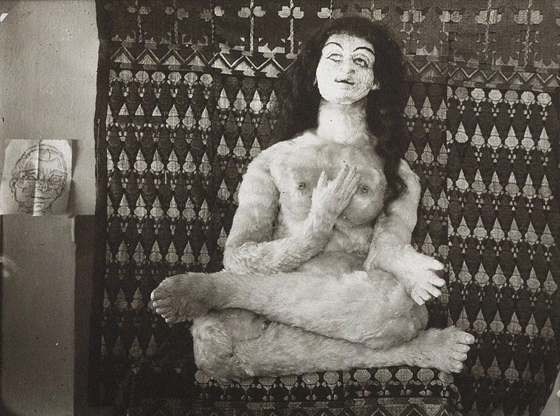 Anyway, Hermine made the doll with skin of sewn together swan pelts (yes, feathers and all). And her eyes are… well see for yourself.