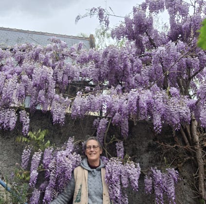 Spring this year is being able to admire our wisteria in full bloom at last, after 3 years of too-early mild weather followed by a morning frost that would freeze the flower buds before they opened. Their sweet aroma will waft onto the porch when we sit outside with some tea in the afternoon sunshine. Heavenly!