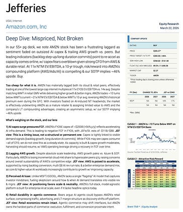 The market is focused on three things: very high AI capex, weak near-term free cash flow, and AWS growing slower than Azure and Google Cloud. Jefferies thinks those are temporary pressures.
