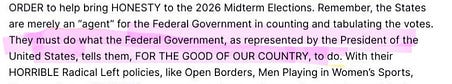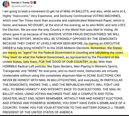 Its not just about mail in voting. Although thats a valid threat, the highlighted portion is the threat. Hes going to remove governing power from the states via EO. The boots on the ground in blue states is to quell dissent and protests.