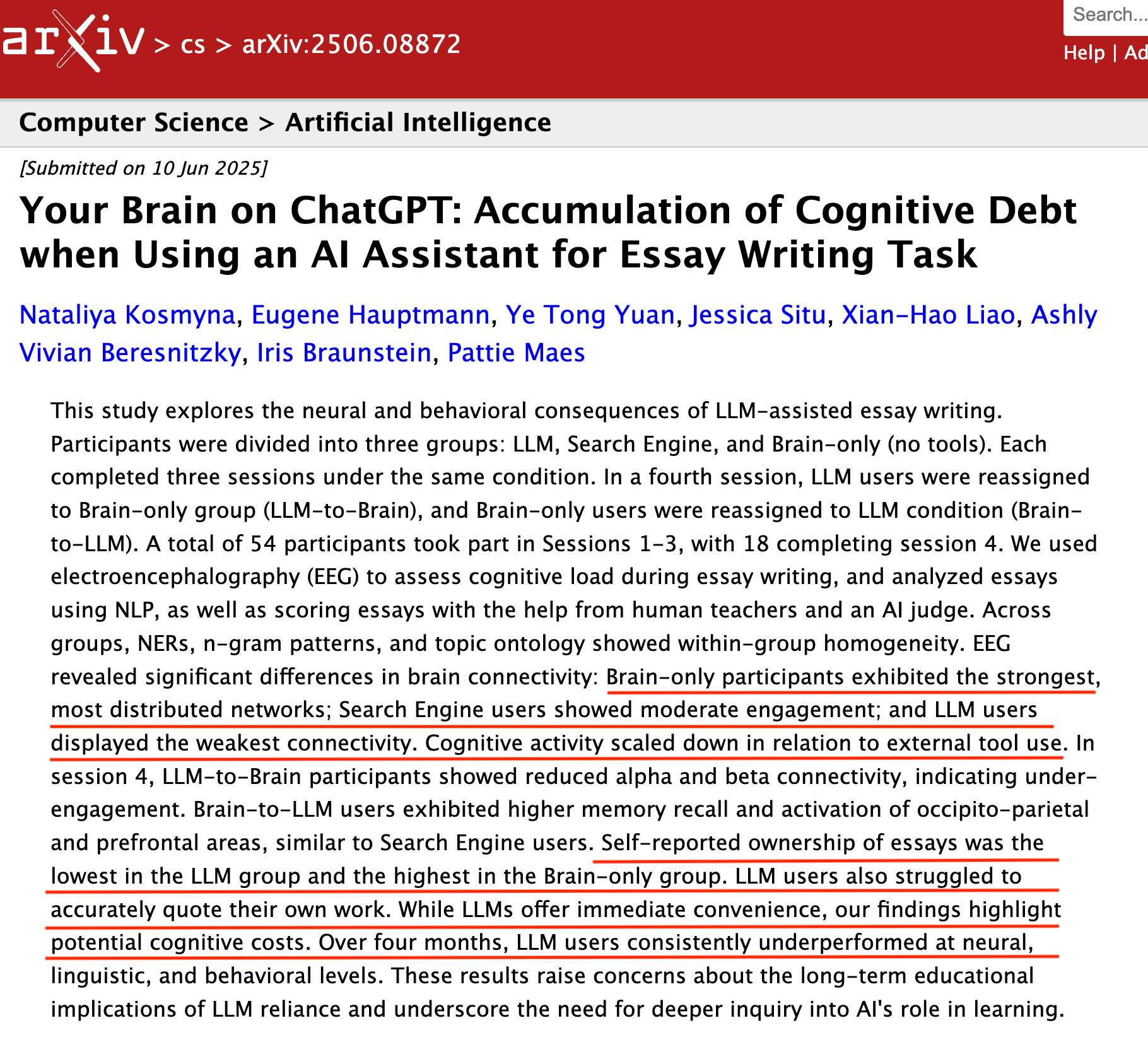 (1) The researchers split 54 university students into groups and had them write essays under different conditions: some used only ChatGPT, some used only search (Google), and some used just their brains. They used some funky machines to assess “cognitive load” during essay writing.