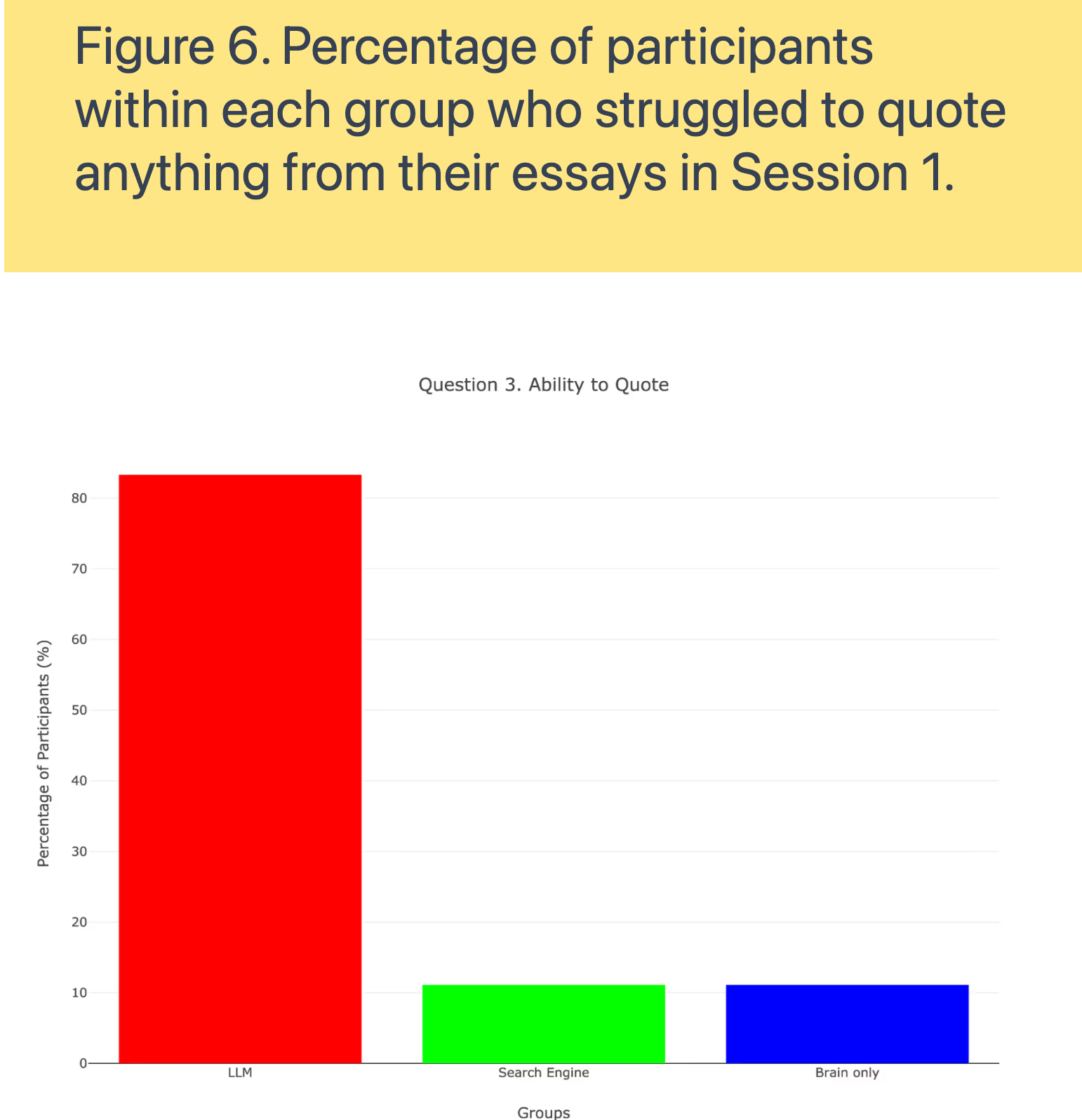 (2) As expected, the ChatGPT group showed the lowest neural activity on EEG scans and had terrible recall. 83% couldn't remember what they'd written, compared to just 11% in the other groups. (See first graph/figure 6)