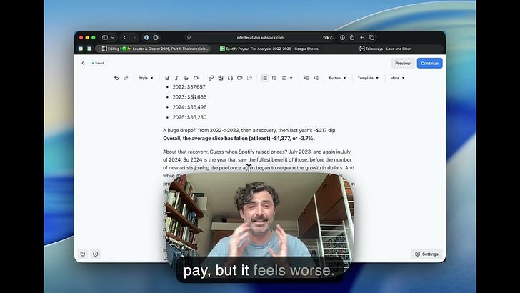 In 2025 the Spotify pie grew +$1B, while the average per-artist slice shrank (at least) -$217. Even if you made more money than the year before, you made less than you otherwise would have.