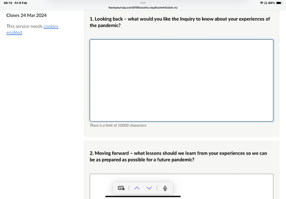 Here are the two leading questions that the NZ public are ‘invited’ to submit to, with a limit of 10,000 characters (2500 words) for each question, for the ‘Covid inquiry’. Did I mention that one Commissioner has already resigned, the other two remaining are Blakely (a captured pro-jab academic granted $millions for ‘pandemic modelling’) and Whitehead, a retired economist who used to work for the World Bank. I think we can preempt the outcome.