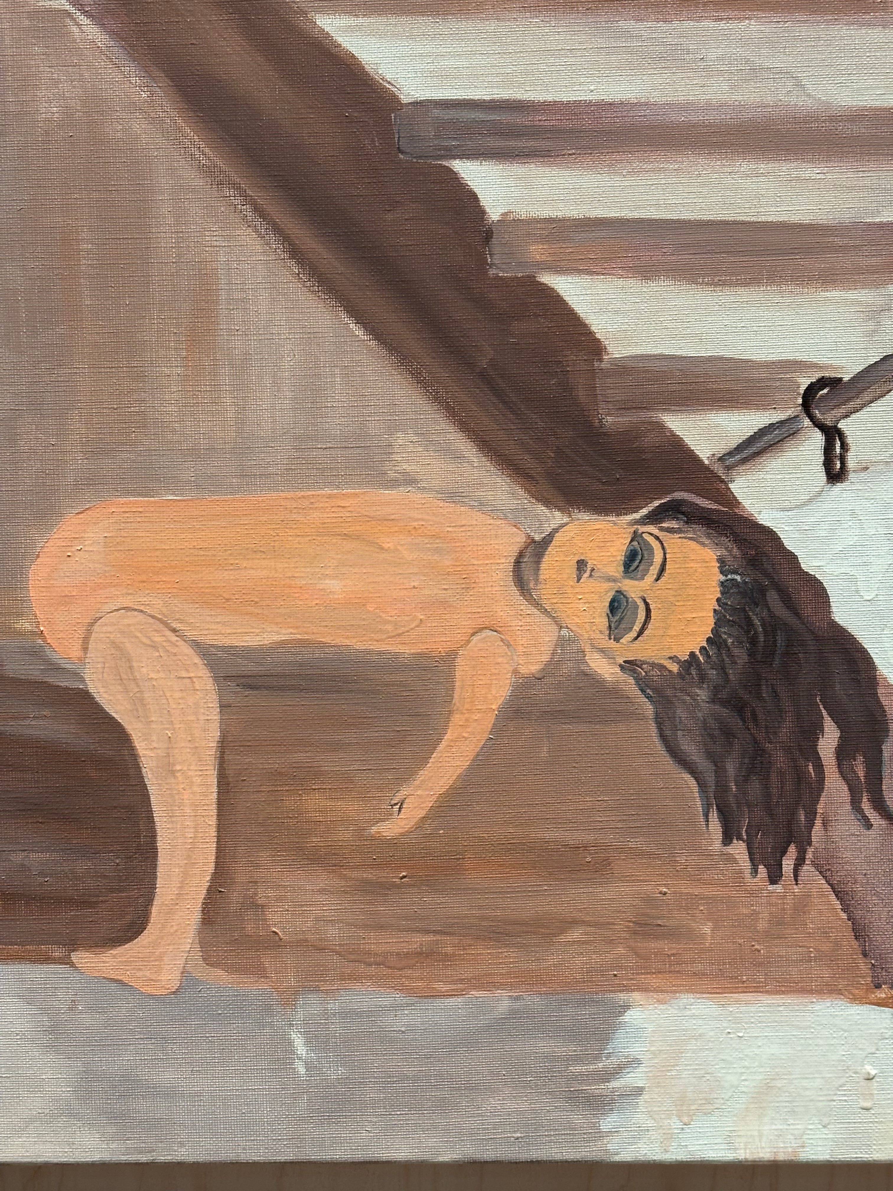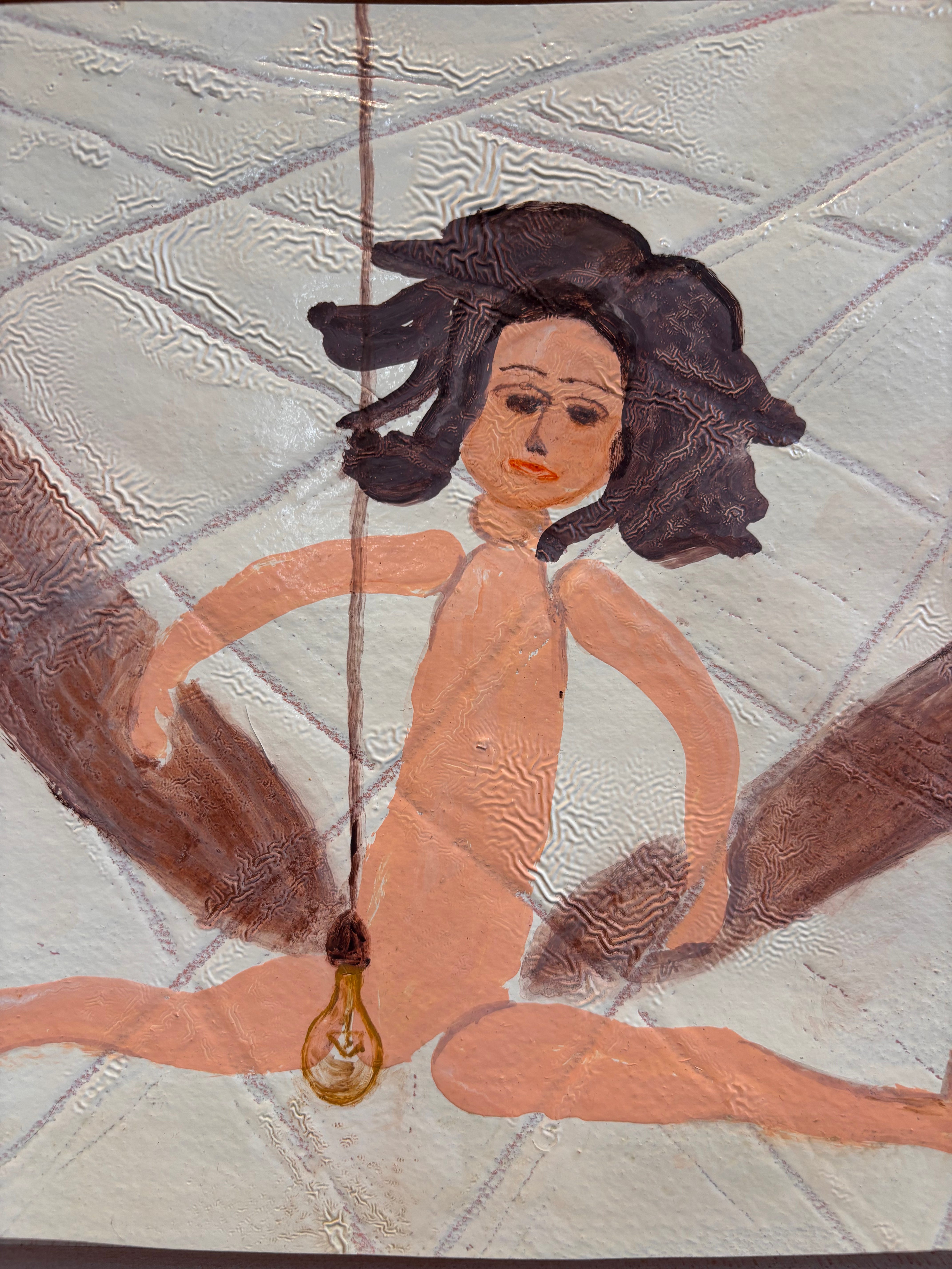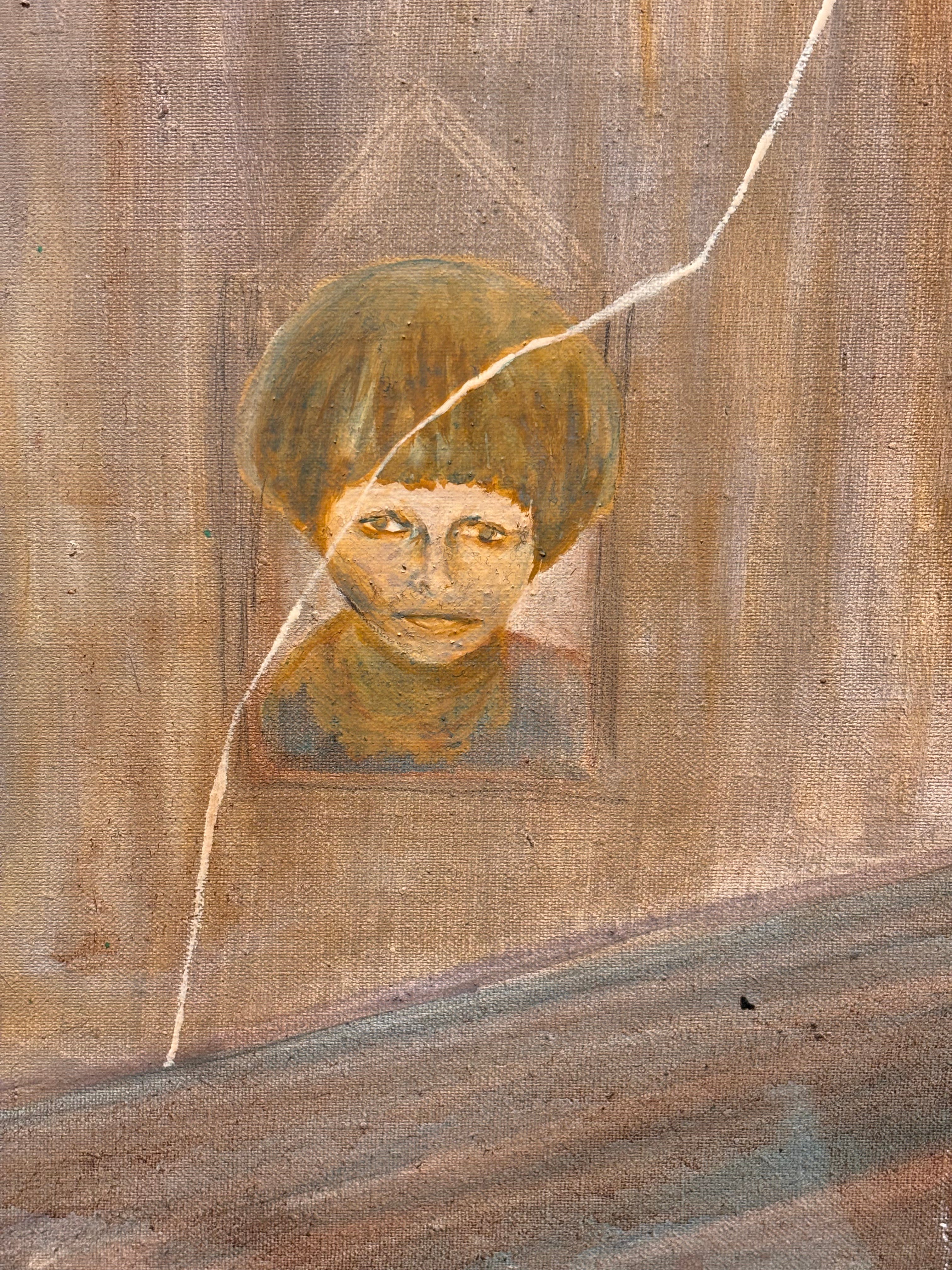 Uiteindelijk belandden we terug beneden op de tentoonstelling met werk van Monique Gies. Ze woonde eerst in een statig landhuis en had een job als directrice van een school. Toen liep ze weg en ging in Parijs wonen, op een zolderkamertje. Ze schilderde, ze huilde en ze ging in psychoanalyse. Meer uitleg kregen we niet.