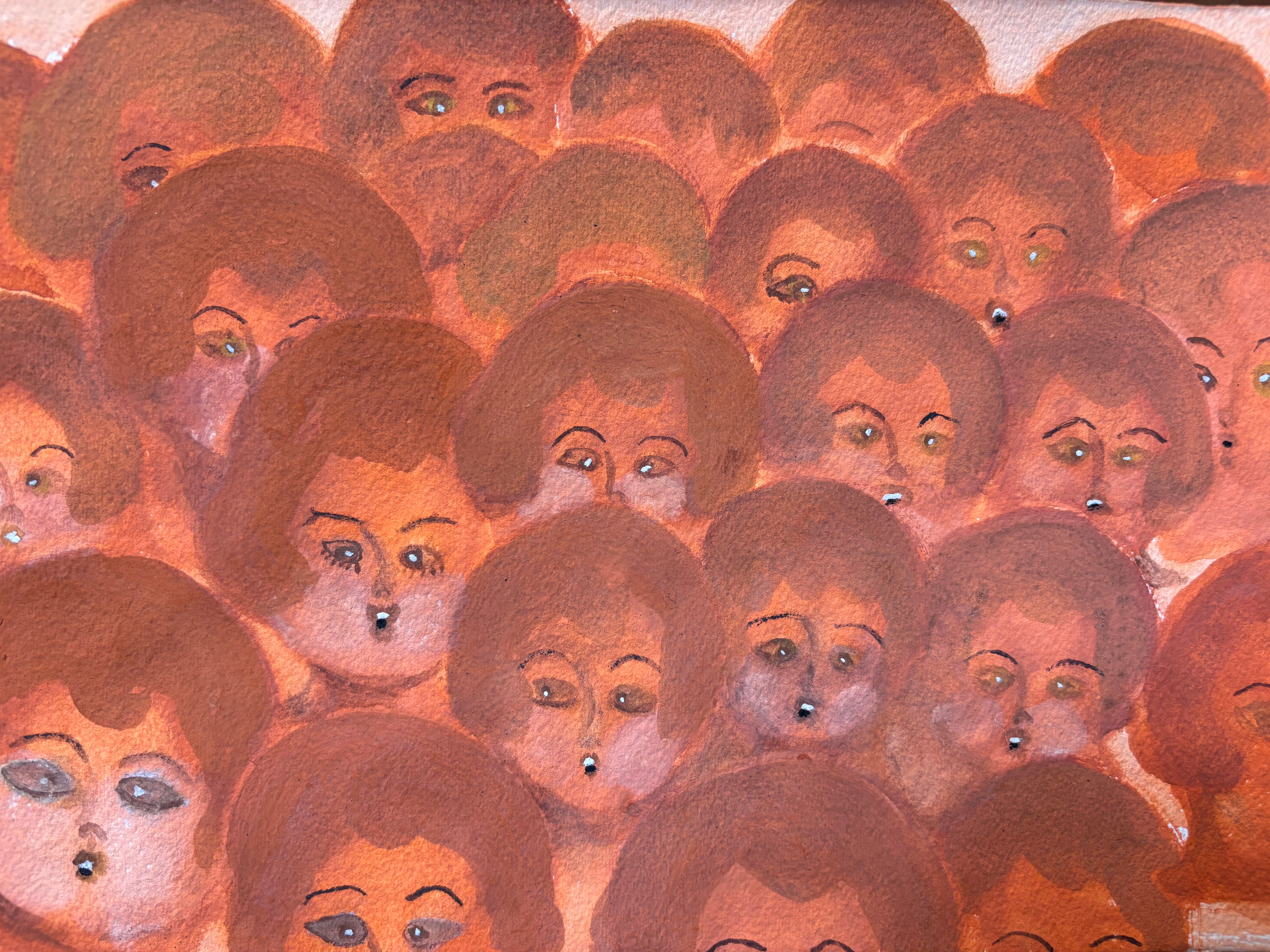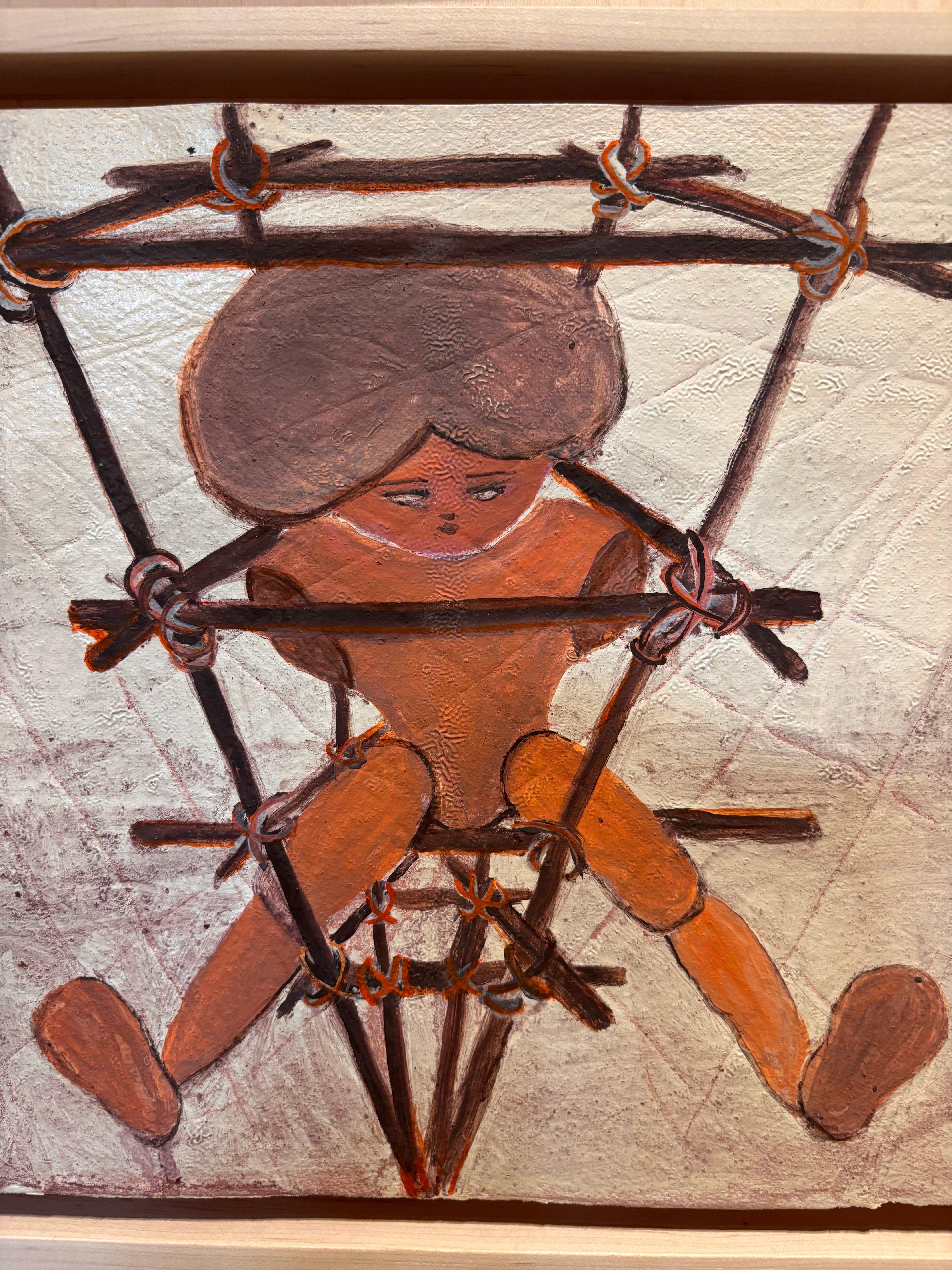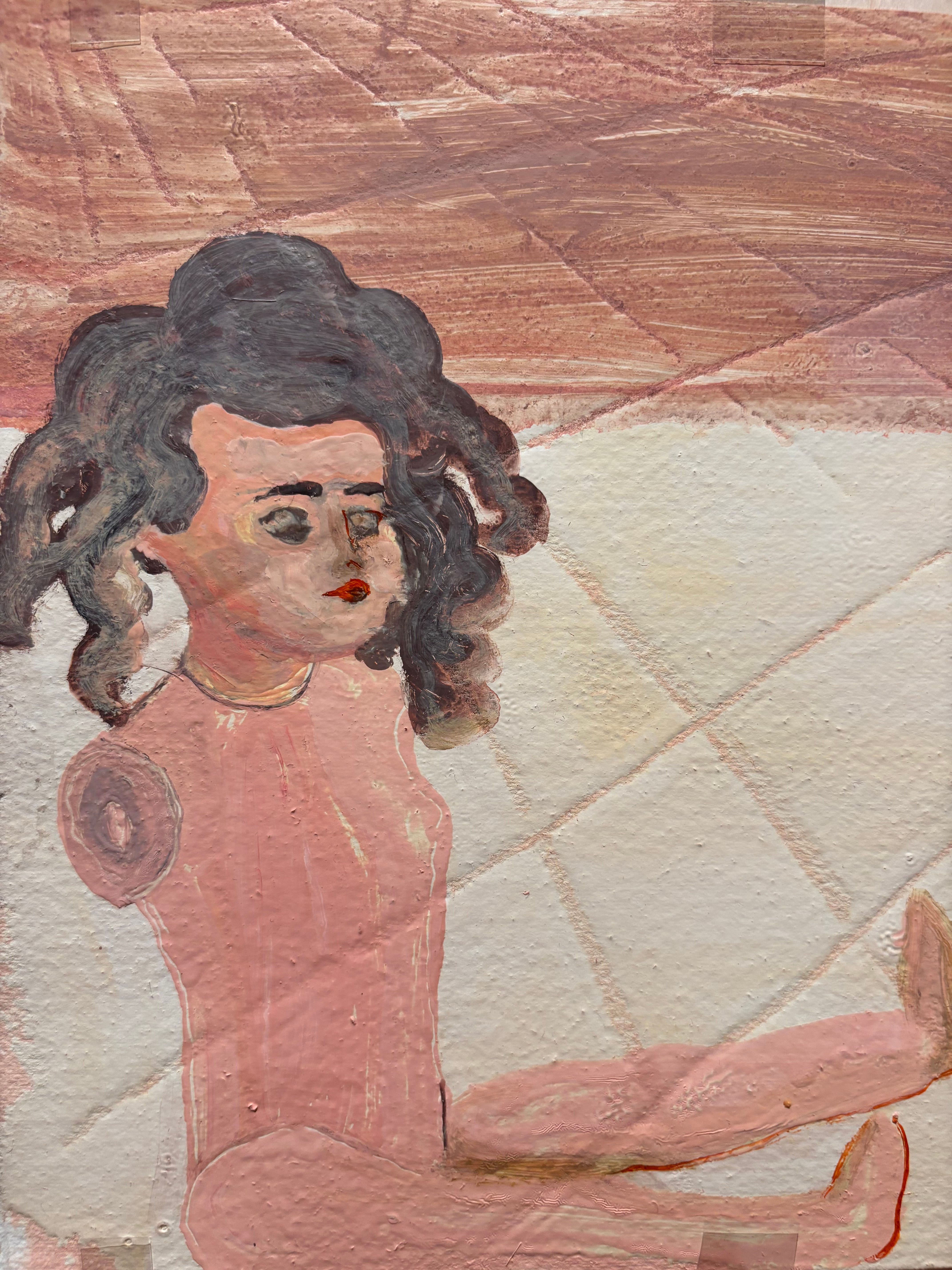 Uiteindelijk belandden we terug beneden op de tentoonstelling met werk van Monique Gies. Ze woonde eerst in een statig landhuis en had een job als directrice van een school. Toen liep ze weg en ging in Parijs wonen, op een zolderkamertje. Ze schilderde, ze huilde en ze ging in psychoanalyse. Meer uitleg kregen we niet.