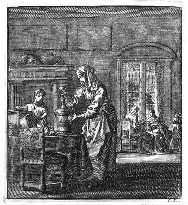 Image:Woman grinding something with a mortar while a child watches. Etching by Jan Luyken. Rijksmuseum Collection, public domain.