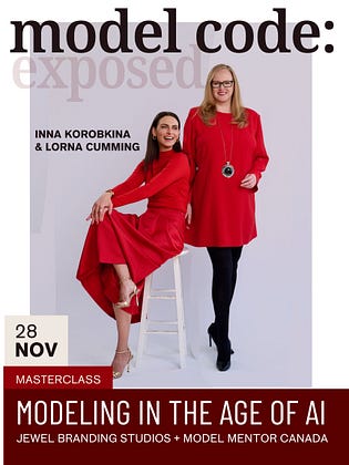 Lorna and I took the opportunity to do a “micro-branding shoot” ourselves at the last Portrait Social to get ready to promote “Model Code: Exposed - modeling in the age of AI”. I chose red for our clothing as it’s a grounding, nurturing colour, and it is also the most attention grabbing, passionate colour. So you can’t miss us when we get started on promoting this project! More to come. Stay tuned!