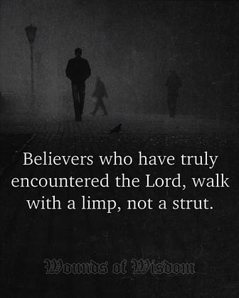 People sometimes expect spiritual maturity to look polished, confident, maybe even impressive. But the saints rarely strut. Read Augustine’s Confessions or Luther’s table talk sometime. These arent victory speeches. They're the journals of men who knew too well their dependence on mercy. The closer a person walks with Christ, the more aware they become of how much grace is carrying them moment by moment. And that awareness changes the gait of a soul. There is a softness, a patience, even a quiet hesitation before judging others because they remember their own night of wrestling. The limp is not weakness in the ordinary sense. It is memory, one that says, “I met God, and I did not walk away unchanged.”