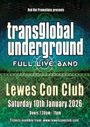 Buy tickets – Transglobal Underground (Live) // Lewes Con Club – lewes con club. Red Hot Promotions presents: Transglobal Underground (Full Live Band Show), Saturday 10th January 2025, Lewes Con Club, Doors 8pm buff.ly/723VJ2l #music #musicians #dance #electronic #world #TransglobalUnderground