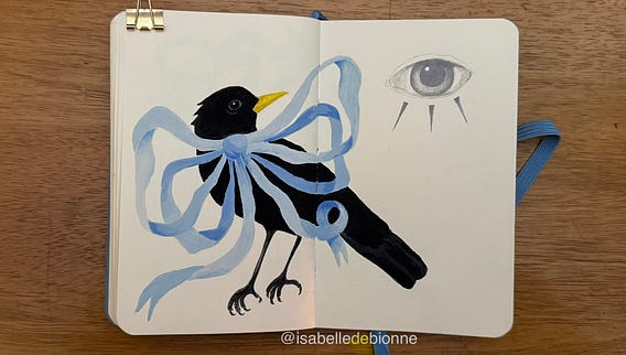 An imaginary black bird adorned in lush ribbons… A more elaborate spread might have included botanicals - I couldn’t decide on a flower though so I left it at that.