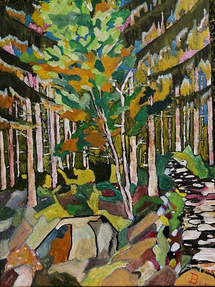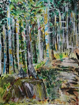 I painted this very small sketch not long after moving to France. Just a corner of the forest with trees growing in and around massive boulders. Here I used oil pastels and acrylics.